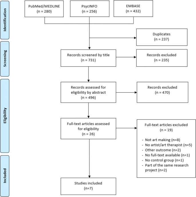 We conducted a literature review with a systematic search. The databases PubMed/MEDLINE, PsycINFO, and EMBASE were searched for articles on fine art therapy among developed (eighteen years and above) cancer patients, published betwixt September 2009 upwardly to September 2019. Search terms were established for each database specifically. A total of 731 publications was assessed for relevance by title and abstract. The remaining 496 articles were examined using three inclusion criteria: interventions were guided past an artist or art therapist, participants were actively involved in the creative process, and feet, depression, and/or quality of life were included every bit outcome measures. Methodological quality of the included studies was appraised using specific checklists.